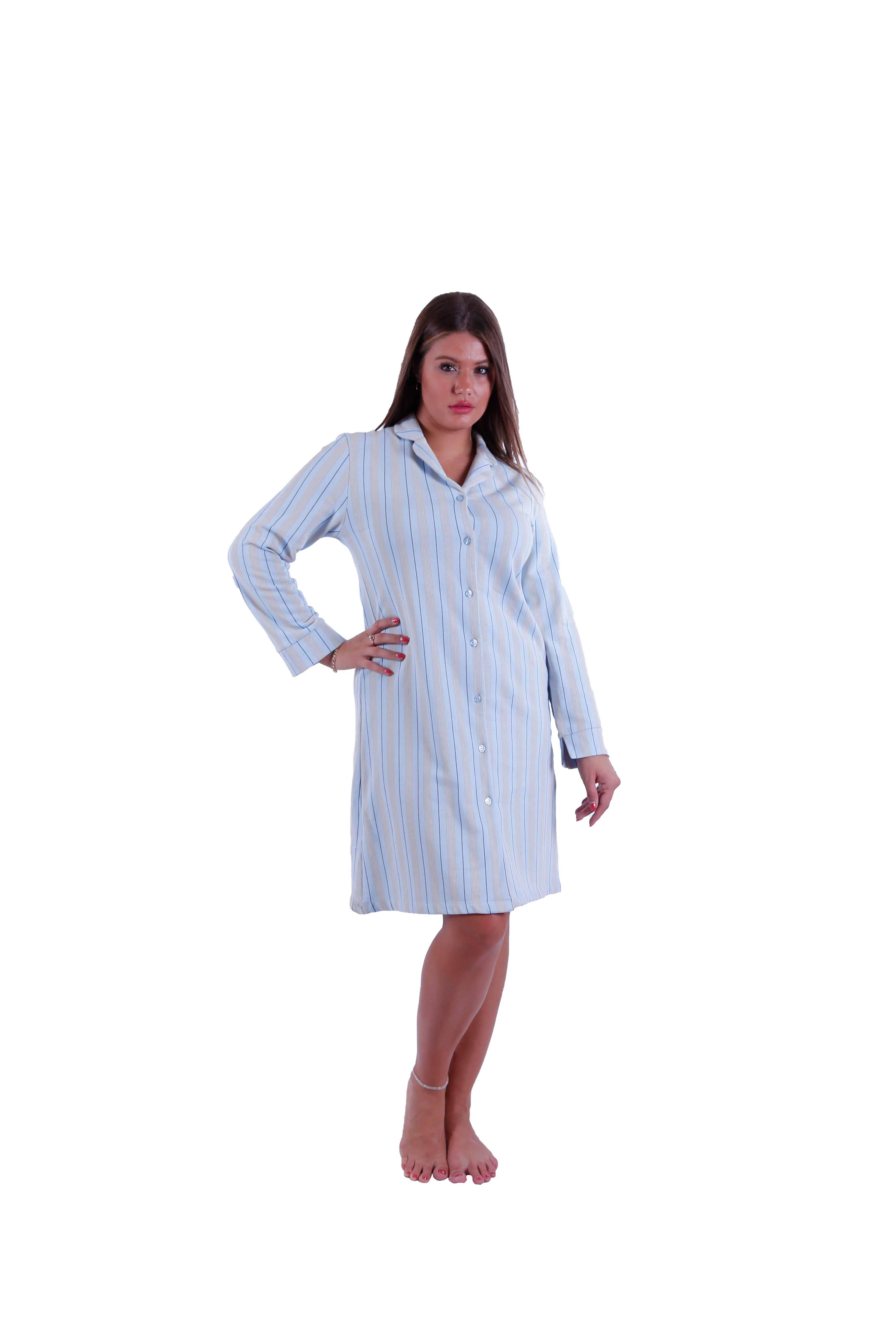 Women LS Dress With Buttons Oatmeal blue stripe